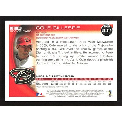 This is a 2010 Topps Update Cole Gillespie baseball card. The card is #US-314 and pictures show condition. Team(s): Arizona Diamondbacks Rookie Card (RC)
