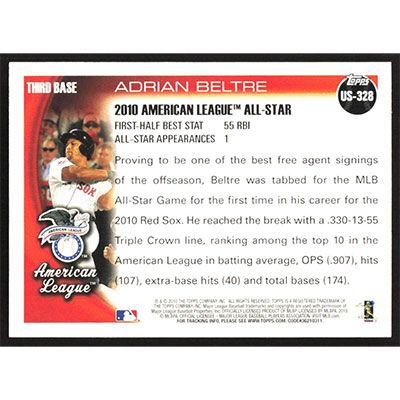 This is a 2010 Topps Update Adrian Beltre All-Star baseball card. The card is #US-328 and pictures show condition.