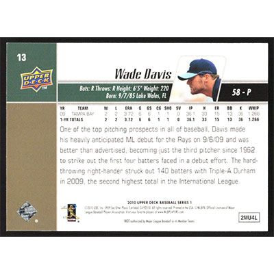 This is a 2010 Upper Deck Wade Davis baseball card. The card is #13 and pictures show condition.