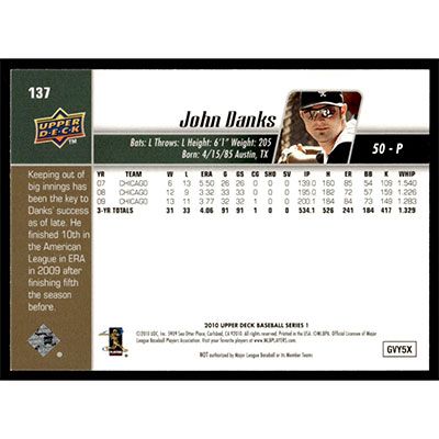 This is a 2010 Upper Deck John Danks baseball card. The card is #137 and pictures show condition.