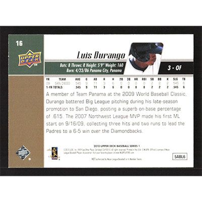 This is a 2010 Upper Deck Luis Durango baseball card. The card is #16 and pictures show condition.