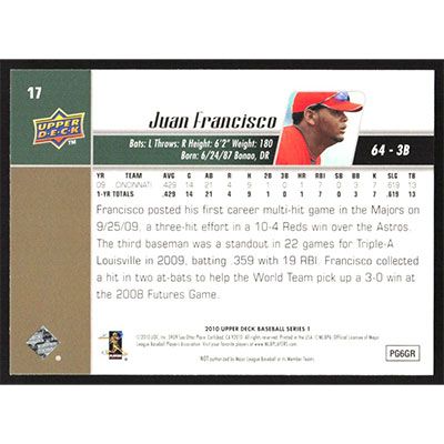 This is a 2010 Upper Deck Juan Francisco Star Rookie baseball card. The card is #17 and pictures show condition. Team(s): Cincinnati Reds Rookie Card (RC)