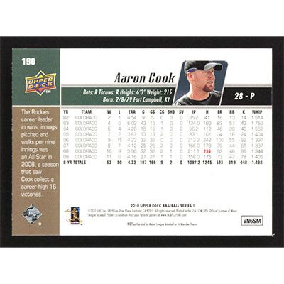 This is a 2010 Upper Deck Aaron Cook baseball card. The card is #190 and pictures show condition.
