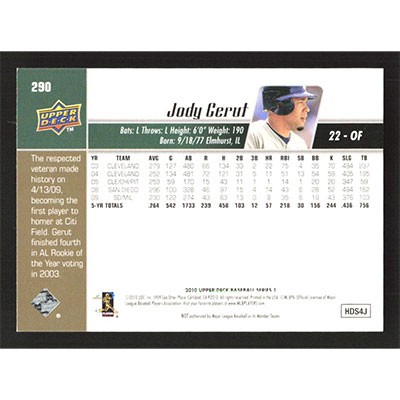 This is a 2010 Upper Deck Jody Gerut baseball card. The card is #290 and pictures show condition.