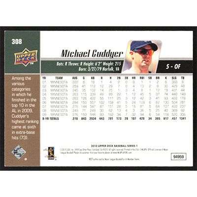 This is a 2010 Upper Deck Michael Cuddyer baseball card. The card is #308 and pictures show condition.
