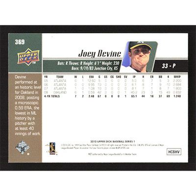 This is a 2010 Upper Deck Joey Devine baseball card. The card is #369 and pictures show condition.