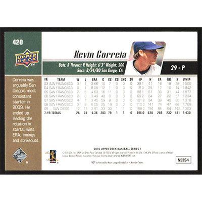 This is a 2010 Upper Deck Kevin Correia baseball card. The card is #420 and pictures show condition.