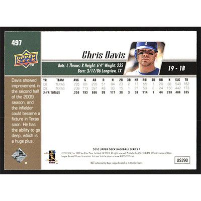 This is a 2010 Upper Deck Chris Davis baseball card. The card is #497 and pictures show condition.