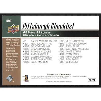 This is a 2010 Upper Deck Zach Duke and Ryan Doumit Team Checklist baseball card. The card is #592 and pictures show condition. Team(s): Pittsburgh Pirates