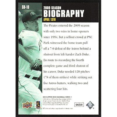 This is a 2010 Upper Deck Season Biography Zach Duke baseball card. The card is #SB-10 and pictures show condition.