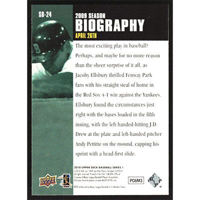 This is a 2010 Upper Deck Season Biography Jacoby Ellsbury baseball card. The card is #SB-24 and pictures show condition.