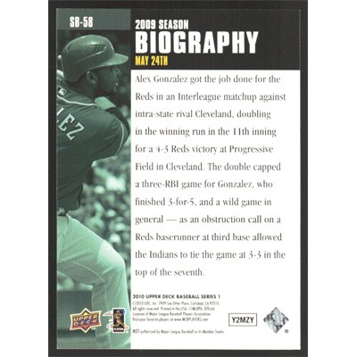 This is a 2010 Upper Deck Season Biography Alex Gonzalez baseball card. The card is #SB-58 and pictures show condition.