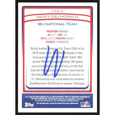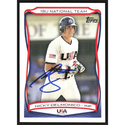 This is a 2010 USA Baseball Nicky Delmonico autographed baseball card. This card has been signed, in blue, by Nicky Delmonico, and is guaranteed authentic by Ballcardz.com. The card is #USA-3 and pictures show condition.