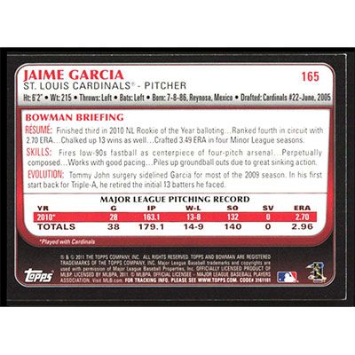 This is a 2011 Bowman Jaime Garcia baseball card. The card is #165 and pictures show condition.
