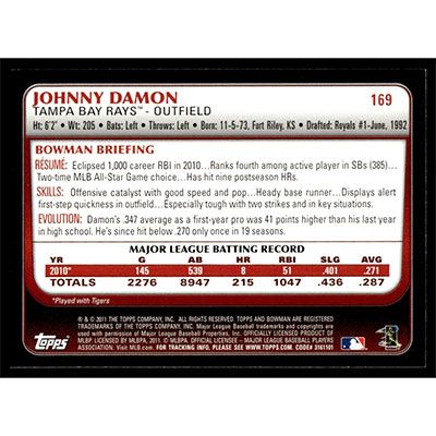 This is a 2011 Bowman Johnny Damon baseball card. The card is #169 and pictures show condition.