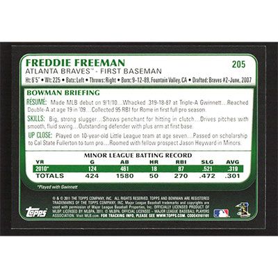 This is a 2011 Bowman Freddie Freeman baseball card. The card is #205 and pictures show condition.