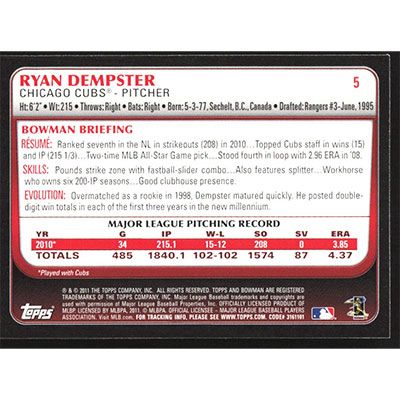 This is a 2011 Bowman Ryan Dempster baseball card. The card is #5 and pictures show condition.