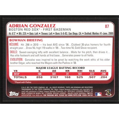This is a 2011 Bowman Adrian Gonzalez baseball card. The card is #87 and pictures show condition.