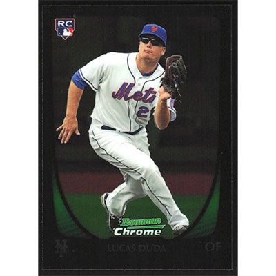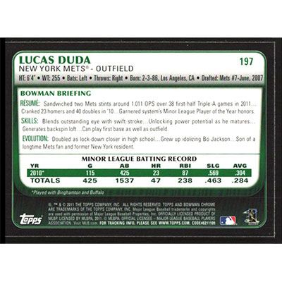 This is a 2011 Bowman Chrome Lucas Duda baseball card. The card is #197 and pictures show condition.
