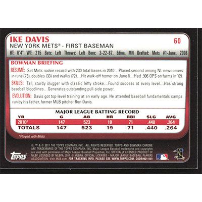 This is a 2011 Bowman Chrome Ike Davis baseball card. The card is #60 and pictures show condition.