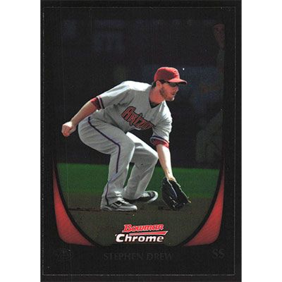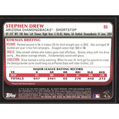 This is a 2011 Bowman Chrome Stephen Drew baseball card. The card is #86 and pictures show condition.