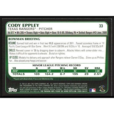This is a 2011 Bowman Chrome Draft Cody Eppley baseball card. The card is #33 and pictures show condition.