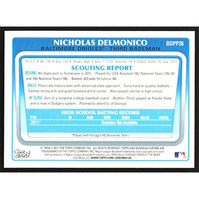 This is a 2011 Bowman Chrome Draft Prospects Nicholas Delmonico baseball card. The card is #BDPP26 and pictures show condition. Team(s): Baltimore Orioles