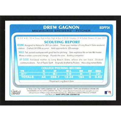 This is a 2011 Bowman Chrome Draft Prospects Drew Gagnon baseball card. The card is #BDPP34 and pictures show condition.