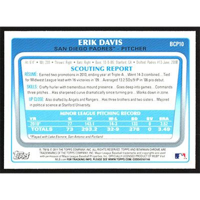 This is a 2011 Bowman Chrome Prospects Erik Davis baseball card. The card is #BCP10 and pictures show condition.