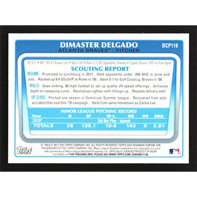This is a 2011 Bowman Chrome Prospects Dimaster Delgado baseball card. The card is #BCP118 and pictures show condition.