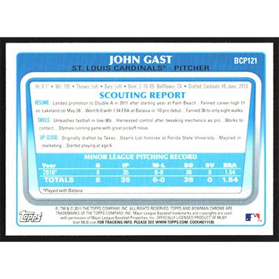 This is a 2011 Bowman Chrome Prospects John Gast baseball card. The card is #BCP121 and pictures show condition.