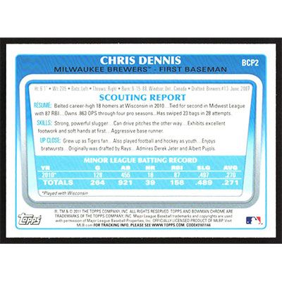 This is a 2011 Bowman Chrome Prospects Chris Dennis baseball card. The card is #BCP2 and pictures show condition.