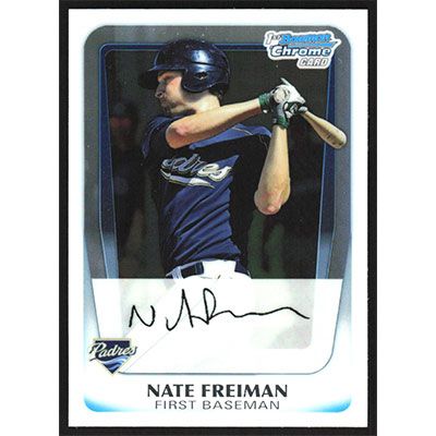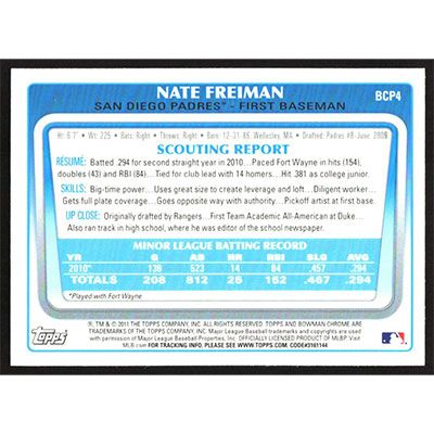 This is a 2011 Bowman Chrome Prospects Nate Freiman baseball card. The card is #BCP4 and pictures show condition.