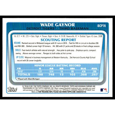 This is a 2011 Bowman Chrome Prospects Wade Gaynor baseball card. The card is #BCP70 and pictures show condition.