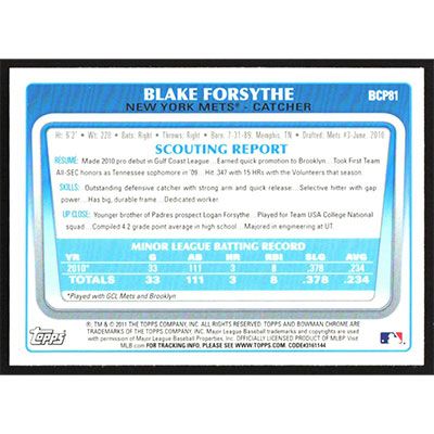 This is a 2011 Bowman Chrome Prospects Blake Forsythe baseball card. The card is #BCP81 and pictures show condition.