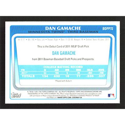 This is a 2011 Bowman Chrome Prospects Dan Gamache baseball card. The card is #BDPP72 and pictures show condition.