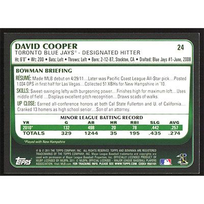 This is a 2011 Bowman Draft David Cooper baseball card. The card is #24 and pictures show condition.
