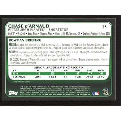 This is a 2011 Bowman Draft Chase d'Arnaud autographed baseball card. This card has been signed, in blue, by Chase d'Arnaud, and is guaranteed authentic by Ballcardz.com. The card is #28 and pictures show condition.