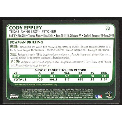This is a 2011 Bowman Draft Cody Eppley baseball card. The card is #33 and pictures show condition.