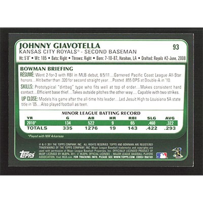 This is a 2011 Bowman Draft Johnny Giavotella baseball card. The card is #93 and pictures show condition. Team(s): Kansas City Royals Rookie Card (RC)