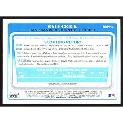 This is a 2011 Bowman Draft Prospects Kyle Crick autographed baseball card. This card has been signed, in blue, by Kyle Crick, and is guaranteed authentic by Ballcardz.com. The card is #BDPP24 and pictures show condition.