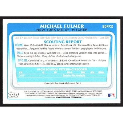 This is a 2011 Bowman Draft Prospects Michael Fulmer baseball card. The card is #BDPP30 and pictures show condition.