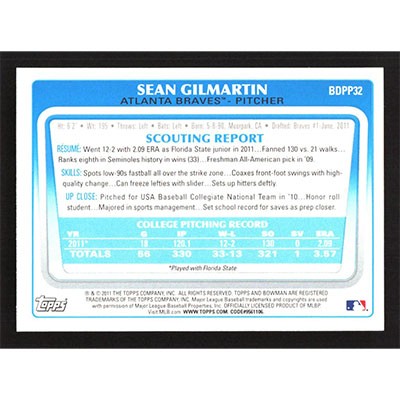 This is a 2011 Bowman Draft Prospects Sean Gilmartin baseball card. The card is #BDPP32 and pictures show condition.