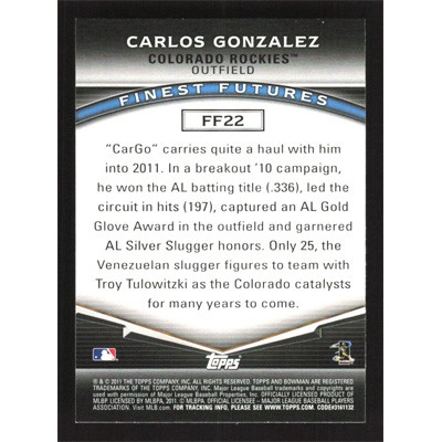 This is a 2011 Bowman Finest Futures Carlos Gonzalez baseball card. The card is #FF22 and pictures show condition.