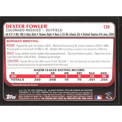 This is a 2011 Bowman Gold Dexter Fowler baseball card. The card is #139 and pictures show condition.