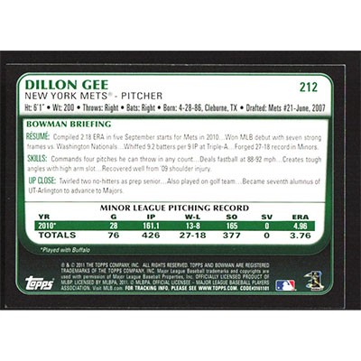 This is a 2011 Bowman Gold Dillon Gee baseball card. The card is #212 and pictures show condition.
