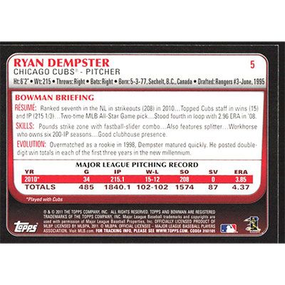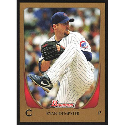 This is a 2011 Bowman Gold Ryan Dempster baseball card. The card is #5 and pictures show condition.