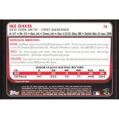 This is a 2011 Bowman Gold Ike Davis baseball card. The card is #74 and pictures show condition.