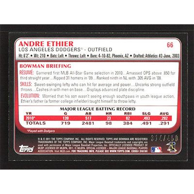 This is a 2011 Bowman Green Andre Ethier baseball card. The card is #66 and pictures show condition. This card is limited; #'d 314/450. Team(s): Los Angeles Dodgers