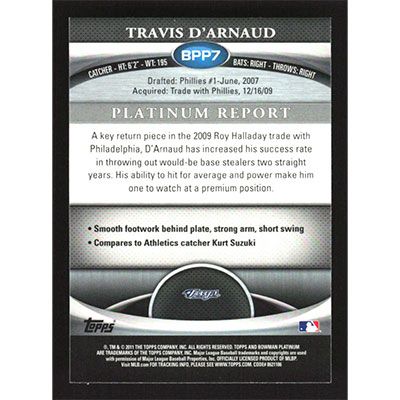 This is a 2011 Bowman Platinum Prospects X-Fractors Travis d'Arnaud baseball card. The card is #BPP7 and pictures show condition. Team(s): Toronto Blue Jays